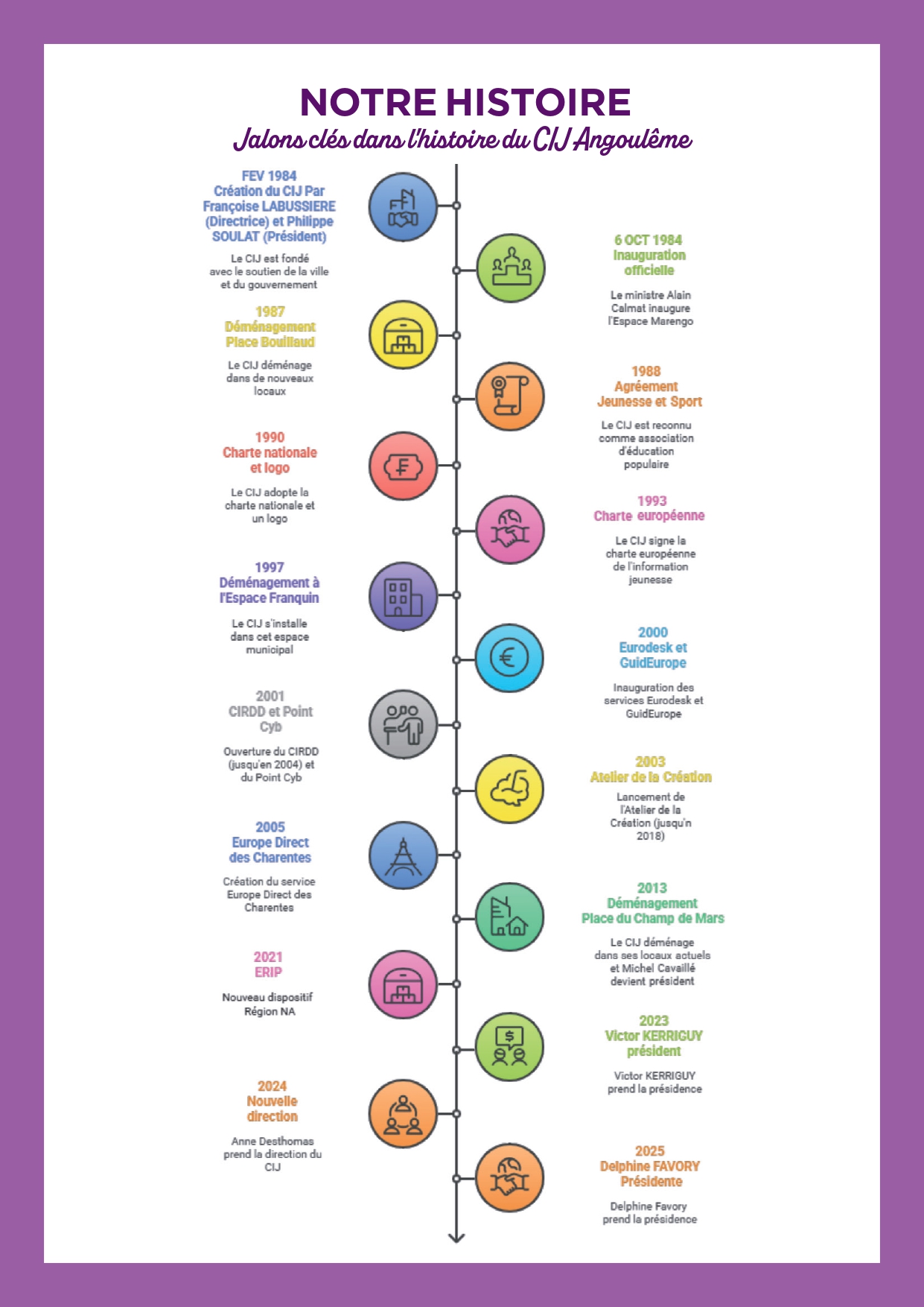 “De grandes étapes ont façonné l’histoire du Centre Information Jeunesse. Chacune reflète un engagement constant pour informer, accompagner et ouvrir le monde à toutes les jeunesses. Une histoire qui se poursuit aujourd’hui, et évolue avec les besoins des jeunes et du territoire.” Anne DESTHOMAS, Directrice du CIJ